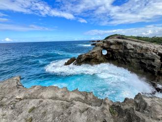 This is the most beautiful coastal reef I’ve seen. The unique layers of blue hues in the sea, combined with the giant jagged rocks and reef, make everything so spectacular. I was in awe of the power of nature. The wind was strong, the waves were powerful, and in that moment, my heart was fully immersed in the natural world. When the waves hit the reef, it feels like the ocean is roaring.