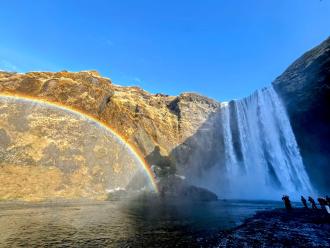 We encountered another spectacular waterfall that left us in awe. Beside the waterfall, we saw a full rainbow, not just one but two. Walking on the black sand beach towards the waterfall felt like opening a book, with the rainbow on the left page and the waterfall on the right. However, unlike a book, this scene was real and dynamic, embodying the magic of nature. Rainbows became such a common sight that we almost saw them at every waterfall and elsewhere.